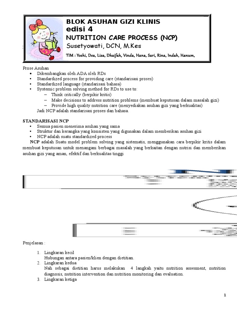 NCP Nutrition Care Process Serangkaian kegiatan yang terorganisir untuk mengidentifikasi kebutuhan gizi dan menyediakan asuhan untuk memenuhi kebutuhan tersebut. The Nutrition Care Process NCP is a systematic method that nutrition and dietetics practitioners use to provide nutrition care. Steps 3 Step 1 Nutrition Assessment Step 2 Nutrition Diagnosis Step 3 Nutrition Intervention Nutrition Monitoring Step 4 Evaluation.